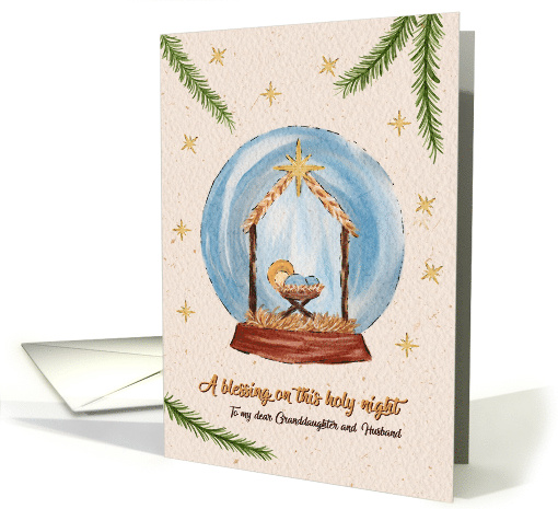 A Christmas greeting card featuring a watercolor-style illustration of a nativity scene inside a snow globe. Baby Jesus lies in a manger under a rustic stable with a bright golden star above. The background is soft blue with scattered golden stars and green fir branches decorating the scene. The front text reads “A blessing on this holy night” in a warm script font. Granddaughter and husband
