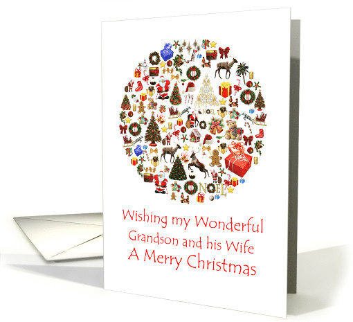 Wish your grandson and his wife a Merry Christmas. A circle full of Christmas goodies, including Santa, lots of presents, Christmas trees, and reindeer. A joyful Christmas card for someone special.