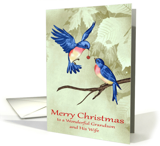 Bluebird nests are built by the female, usually in a cavity created by another bird or in an artificial birdhouse. They have weak bill so they cannot carve out their own cavities. It takes two to five days of hard work for the nest to be completed. Nests are light and delicate–consisting of grasses, hair fibers, feathers and needles. The nests are built with a small, cap-like shape near the center to help hold eggs in place. Wish your wonderful grandson and his wife a Merry Christmas with a card featuring a beautiful blue bird with a red ornament in his beak flying close to another blue bird sitting on a branch on a leafy background with dark text. Birds by Digital Designs by Elena.