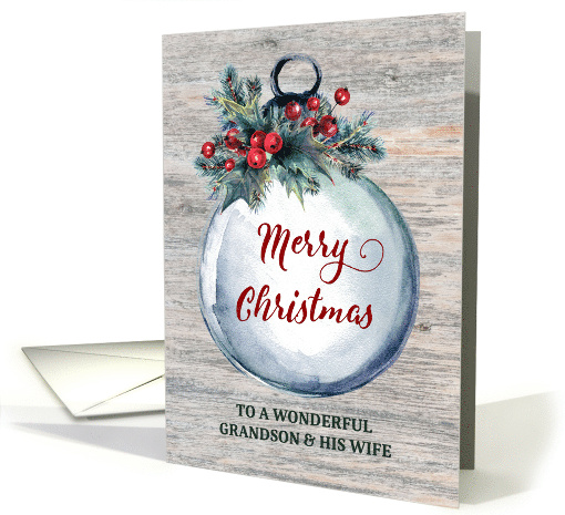 A charming rustic Christmas card for your grandson and his wife with a vintage Christmas bulb with holly berries and leaves.