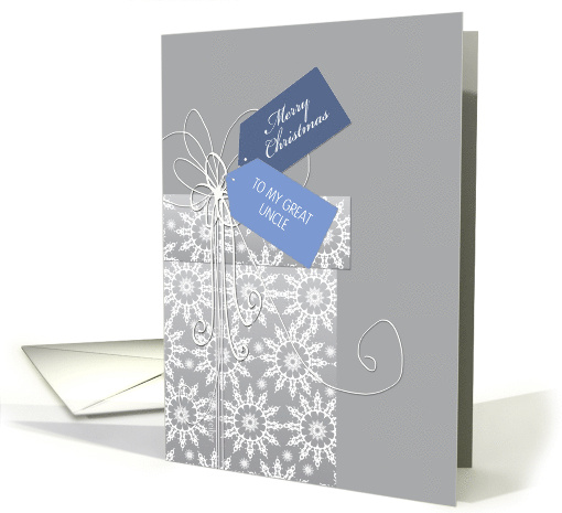 Send warm Christmas wishes to your great uncle with this contemporary Christmas card. This elegant card features a present or gift (wrapped in grey gift wrap paper with white snowflakes) white swirly ribbon and tags. You can edit text inside card yourself
