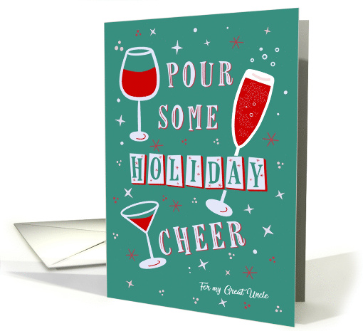 This festive greeting card features retro-style typography with red holiday drinks and the cheerful pun “Pour Some Holiday Cheer.” Set against a teal background with playful stars and sparkles, it's the perfect card to celebrate the season in style. Whether you're toasting with wine, bubbles, or a holiday cocktail, this card brings the party spirit to any loved one. For Great Uncle
