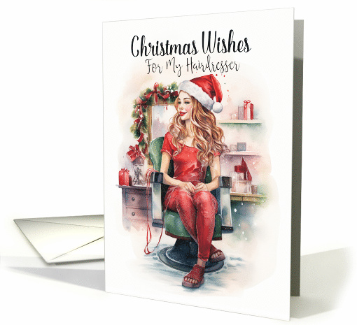 Christmas card for you hairdresser with a pretty lady who has a wonderful Christmas hairdo with a Santa hat and Christmas Trees, sitting in a salon chair