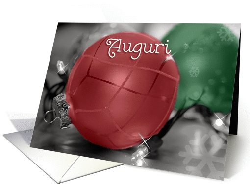 A Italian Christmas card that says "Seasons Greetings" in Italian with a photo of a red ornament and a green ornament with lights and faded snowflakes on the right side.