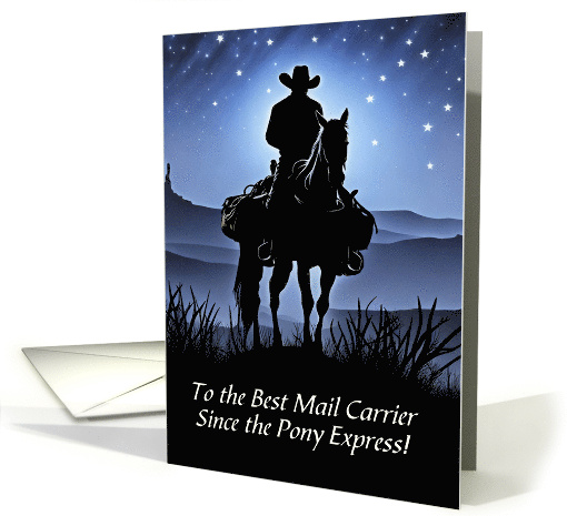 To the best mail carrier since the pony express! A fun happy holidays card with a cowboy and horse silhouetted on a winter night.