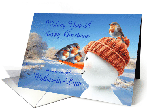 A beautiful Christmas card for a mother-in-law. Send seasonal cheer with this beautifully illustrated Christmas card showcasing three cheeky robins balancing on a snowman's carrot nose. A joyful design capturing the magic of winter and the spirit of the holidays.