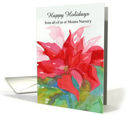Custom Merry Christmas greetings featuring a vibrant red poinsettia flower and a delicate pink one in the background accented with blue and green hand painted with watercolor. Customize with a message to greet your customers for the holiday season.