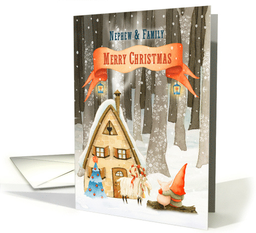 Send whimsical Merry Christmas greetings to your nephew and family with this nature scene featuring a gnome sitting on a log with a pig, a goat, a Christmas tree, and a cute gnome home. This design also has trees, snowflakes, and a glowing lantern. You add your name to the front of the design.