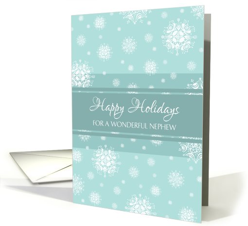 Happy Holidays for nephew Christmas card, modern and contemporary in elegant teal and white snowflakes pattern.