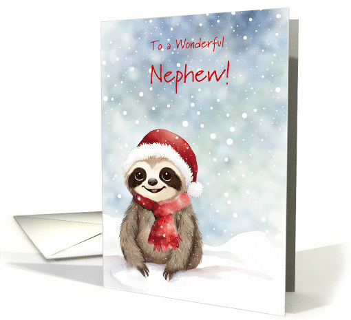 A charming card for a fantastic nephew! Featuring an adorable sloth in the snow, wearing a scarf and Santa hat, with customizable text.