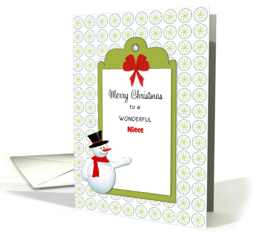 CUSTOMIZE THE FRONT & INNER VERSE of this Christmas greeting card for Niece, with illustration of a snowman, wearing a black top hat & red scarf, sitting over a green tag with bow design. Change relationship to Son, Godson, Grandson, Daughter, Granddaughter, Goddaughter, Niece, Nephew