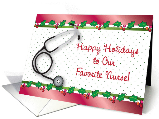 This is a Christmas card for a nurse, featuring a stethoscope on a background with green and red ribbons with holly. You may change the inside message at checkout, if you wish. 082312