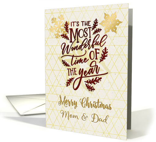 Send sophisticated golden Merry Christmas greetings to your mom and dad with this design featuring word art saying "It's the most wonderful time of the year" with snowflakes on a modern geometric pattern background.