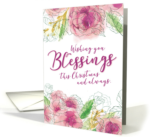 Wish someone a merry christmas with this elegant calligraphy typography design, featuring the message "Wishing you Blessings this Christmas and Always." Background includes pink watercolor flowers. Inside can be customized with your own message.