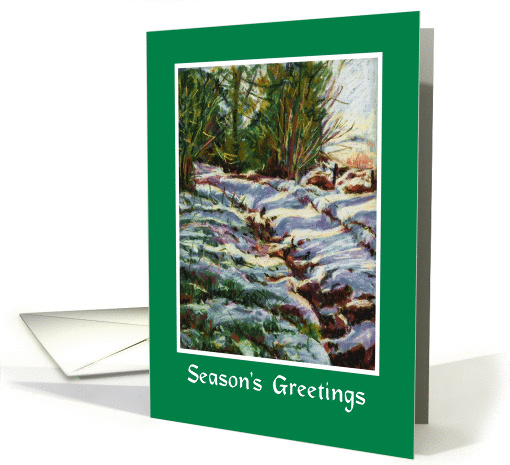 A Christmas Card with a snowy landscape and 'Season's Greetings' from a soft pastel painting by Judy Adamson. Please contact me through my store if you would like the front cover text changed and the inside is left blank for your own message.