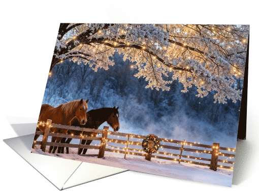 Christmas Seasons Greetings Country Horses with Fenced Pasture Lights