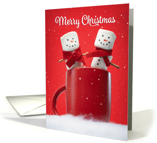 In a large red mug sits two fun-loving snowmen made of marshmallows enjoying the fresh snow on a red background. a cute way to wish anyone a Merry Christmas.