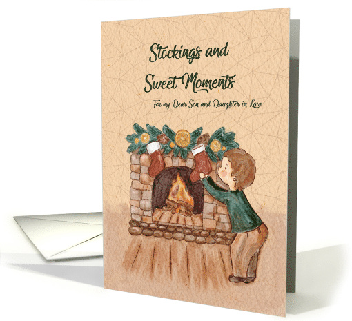A watercolor-style Christmas card featuring a young child hanging red stockings on a stone fireplace. Above the fireplace, there's a festive garland made of pine leaves, pinecones, and dried orange slices. A cozy fire glows in the hearth. The text on the front reads “Stockings and Sweet Moments”. Son y daughter in law