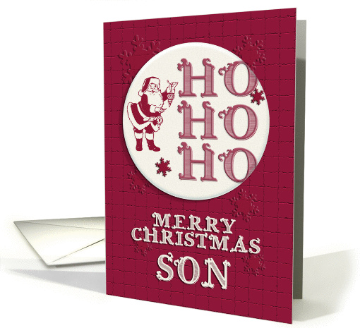 Send Merry Christmas greetings to Son with this retro look design that features a big cream colored button with Santa and the saying Ho Ho Ho on a burgundy background that has been digitally textured with subtle snowflakes. Front text says "Merry Christmas Son."