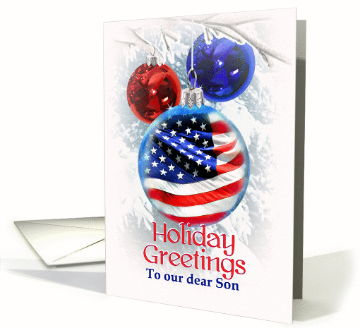 A star-spangled American flag shines from within a Christmas ornament in this patriotic Holiday greeting to your Son. This is especially appropriate for a Son serving in the military. You may change the inside text to express your own holiday wishes.