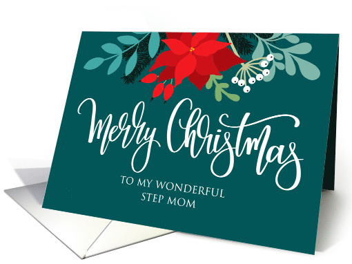 A lovely card with Christmas florals (including poinsettia, rosehip, Winter berries and pine branches) on the top of the card with the words Merry Christmas to my wonderful step mom on the front of the card.