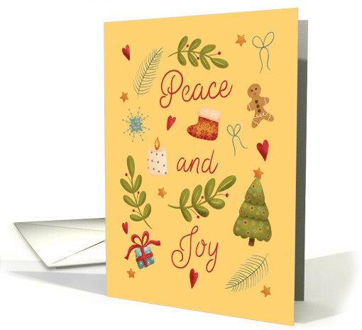 The Christmas card has a cheerful yellow background adorned with an assortment of Christmas elements sprinkled across the front. Among the decorations are a classic Christmas tree, a glowing candle, a gingerbread cookie, a delicate snowflake, festive bows, a cozy Christmas stocking, holly berries, and stars. The colors used are vibrant and festive, including shades of green, red, teal, orange, cream, and yellow, creating a warm and joyful holiday feel.