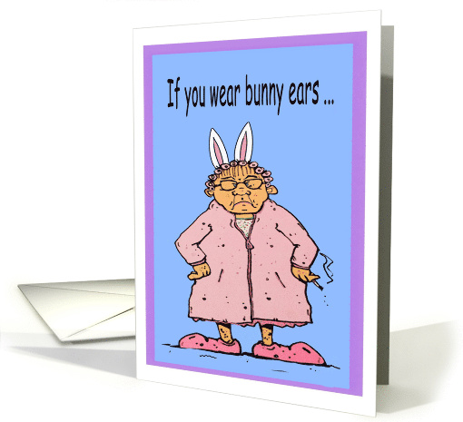 A grumpy looking woman wearing a pink robe is wearing Bunny ears. why? because if you listen really carefully you can hear the Eater bunny coming. A funny Easter card, sure to give everybunny a good laugh.