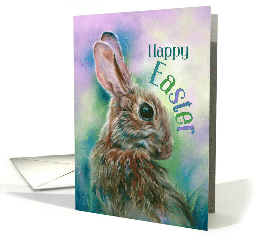 This colorful secular Easter greeting card is adorned with wildlife art in soft pastel hues picturing a bunny rabbit in profile against a background of purple, blue and green grasses. Multi-hued letters along a curve spell ‘Easter.’