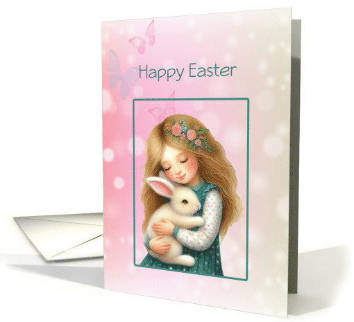 Wish Happy Easter to friends and family with this adorable image of a blonde haired little girl holding a white bunny rabbit. The girl is wearing a pale green dress. The background is a pale green and pink with butterflies fluttering about.