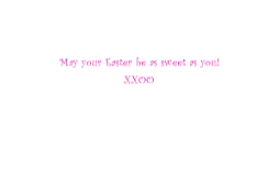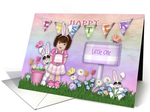A colorful banner that reads Happy Easter in the background. A sign that says little one, sits in the bed of flowers. An adorable little girl dressed in a cute pink dress. A sweet little white bunny is peering out from behind the girl. The other white bunny peers from behind the blue bells. The inside message reads: " May your Easter be as sweet as you! XXOO " Inside message may be changed by you.