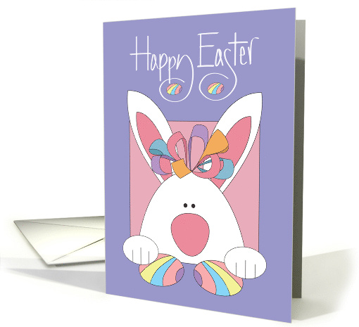 What a delightfully cute little white bunny fills this fun Easter card for a little girl you know, whether a family member, neighbor or friend. She's wearing a multi-colored bow on the top of her head, in colors of pink, lavender, blue and orange. The bow fills the area between her two tall and pointed bunny ears. At the bottom of the card, her two front paws hold two large decorated Easter eggs that she will be hiding for the Easter egg hunt. The eggs have the same coloring as her Easter bow. Topping the lavender card is the white hand lettered wording of "Happy Easter", that swirls its way across the card. The inside wording of the card says "Peek-a-boo Easter wishes, for a special girl, with hugs and kisses!"