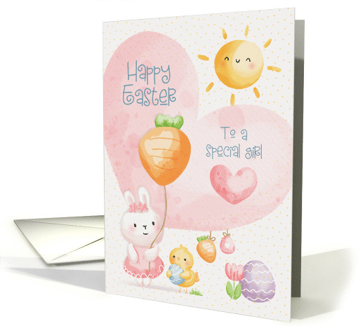 A special little girl is sure to be delighted with this adorable Happy Easter greeting featuring a bunny carrying a carrot balloon, a little chick, Easter eggs, and a smiling sun.
