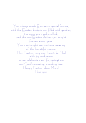 Send Easter greetings to your Mother with this cute Easter card featuring a white lamb in a field of pastel tulips. Your Mom was probably the one who filled your Easter basket with delightful goodies for you, bought you those new Easter clothes, or dyed the eggs for the egg hunt you so enjoyed as a child. Send her your love with this colorful Easter card and let your Mother know how much she is loved and appreciated on Easter and always.