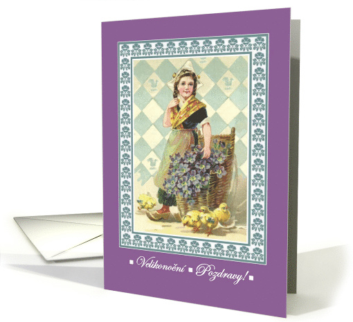 This Easter card features a Dutch girl with chicks and a greeting in Czechoslovakian. The girl wears a Dutch cap and wooden shoes. Image is reworked from a vintage postcard. In English: "Easter Greetings / (inside) May all the joys of this glorious season be yours". You may add to/change the inside sentiment - just click on "Personalize".