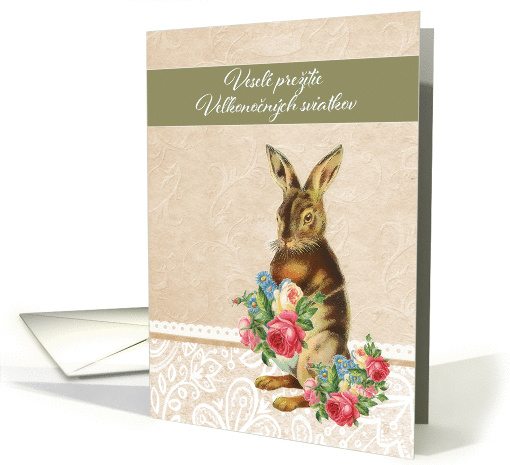 Translation: "Happy Easter" in Slovak. This nostalgic Easter card features a cute vintage bunny offering a bouquet of roses and blue flowers (courtesy Graphicsfairy). Background lace effect. You can edit text inside card. Custom requests welcome.