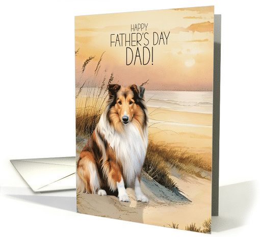 A lovely Father's Day card for the guy who loves his Rough Collie dog with a summery feel and scenic sandy beach theme.