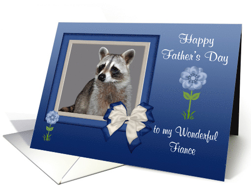 Father's Day to Fiance, Raccoon in blue bow frame with blue flowers