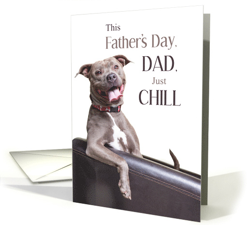 Cute grey and white, sometimes called a Blue Nose, pit bull terrier sits with a smile in Dad's leather chair to create a fun Father's Day card for the dog dad.