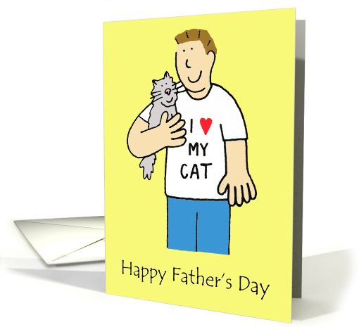 Colorful cartoon of a man wearing a t-shirt that says 'I love my cat'. He is holding a small grey kitten. The front of the card says ' Happy Father's Day ' and inside, the card says 'From the cat'.