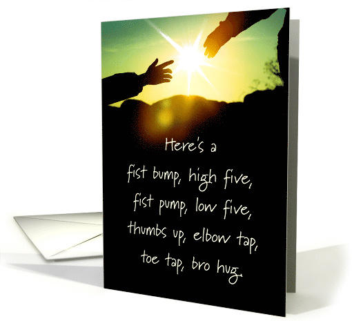 Celebrate Father's Day near or far with this manly poetic reaching hands card. Front text: Here's a... fist bump, high five, fist pump, low five, thumbs up, elbow tap, toe tap, bro hug