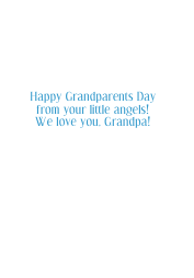 Your Grandpa will love this special card that is just for him on Grandparents Day, with the trio of little fluffy bears floating in the blue sky and flying their colorful kites. The little angelic wings on their backs are keeping them afloat as they soar into the air, along with their kites. The large hand lettered word "Grandpa" tops the card, with tiny hearts of love filling the air all around the little bears. The fun inside wording of the card is "Happy Grandparents Day from your little angels! We love you, Grandpa!"