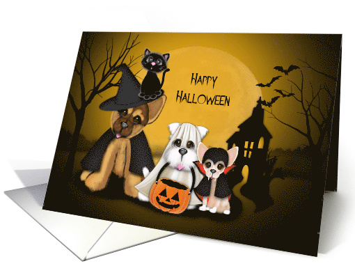 Happy Halloween, for a young girl or boy. This cute halloween scene has a german shepherd puppy with a black witches hat and a very cute black cat perched on the hat, he is also wearing a black cape. The sweet white schnauzer is a ghost holding a pumpkin treat basket. An adorable chihuahua puppy is dressed in a vampire costume with a black and red cape and extra long fangs. Backdrop is a yellow glowing moon with an scary old house with bats flying around it. Inside message says: May your Halloween be spooktacular! Inside message can be changed by you.