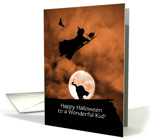 Kids Happy Halloween card with black cats and a witch flying in the night. A enjoyable card for that special child!