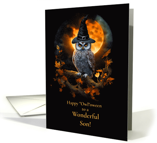 To your son on Halloween! A plump little owl perches on a branch beneath an orange-hued moon, surrounded by the colorful leaves of autumn.