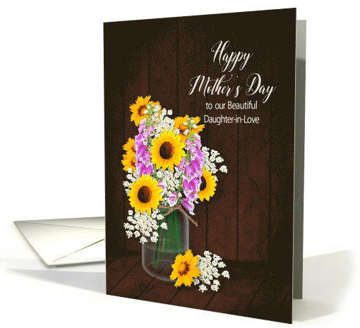 Charming greeting with a country flare. Bouquet of country flowers in a mason jar. See other categories including invitations, thank you, and etc. with same image. Card front says, Daughter-in-love, representing the family relationship, Daughter-in-law.It