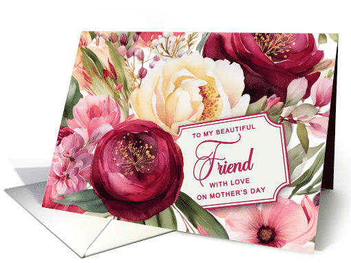 To Friend with Love on Mother's Day. Elegant watercolor painted peonies and roses with lush foliage and greenery, accented with a vintage 19th century style sign. Classic traditional typography with stylish handwritten script in red on white background.