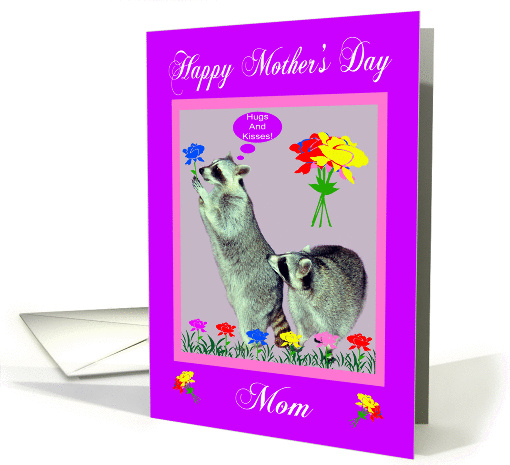 Mother's Day To Mom, raccoons with flowers on purple in pink frame