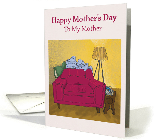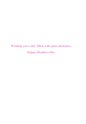 This Mother’s Day, wish your Mother a day filled with the quiet pleasures of a favorite chair, a comfy pillow and blanket and a good book with this MOTHER’S DAY SERENITY card. Set on a linen-like background, with your greetings matching the chair’s maroon. A simple messenger for Mother’s Day.