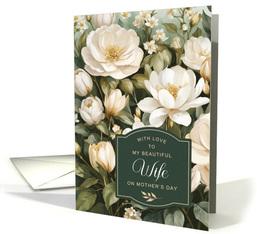 To my Beautiful Wife with Love on Mother's Day. Elegant watercolor painted magnolia blooms with lush foliage and greenery, accented with a vintage 19th century style sign. Classic traditional typography with stylish handwritten script on hunter green background.
