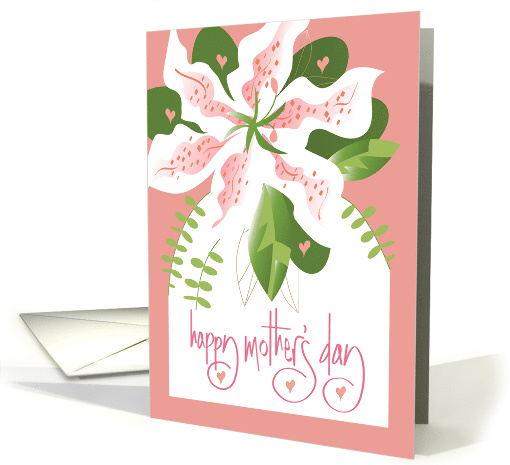 This beautiful floral Mother's Day card will be perfect to share with any of the special ladies you know, as a touching and fun way to say Happy Mother's Day. A large pink and white lily drapes over the top of the card, with green vines that canopy downward, enclosing the pink hand lettered wording of "Happy Mother's Day". Three tiny hearts accent the hand lettered wording and some also add your love to the deep green leaves that surround the lily. The card's inside wording says "With love to you on Mother's Day!"